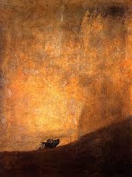 (3) “Es posible que este perro sea un figura mitológica, forme parte de un discurso narrativo…Pero ya ha producido, y produce, su efecto, ya podemos identificarnos con esta imagen, que habla directamente de nuestra situación y corrige el eventual optimismo de la modernidad. No sabemos si el perro se hunde o no, sólo podemos verle en el preciso momento en el la ambigüedad domina la situación y por ninguna parte aparece terreno firme sobre el que apoyarse… El perro es la representación más rigurosa de la soledad y la falta de seguridad, de la autoconciencia de esa situación, de su carácter absoluto. Bozal Valeriano, Goya, Madrid, Alianza cien, 1994, p., 57.