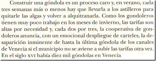 Morris se ocupa de las góndolas, del trasporte acuático y de los canales en distintos momentos del texto. Por ejemplo, trata de las regatas y de las cooperativas de gondoleros en las pp. 44-46, de la delicada navegación urbana en las pp. 167-168, de los cortejos fúnebres en motora en las pp. 173-174, de los cruceros que llegan en la pp. 268-269, etc.